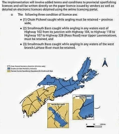 As detailed in the attached, a new requirement for all anglers in Nova Scotia for 2025 will be mandatory retention of any chain pickerel in the province, and mandatory retention of any smallmouth bass in the areas identified, notably the West Branch Lahave River and all areas east of Highway 102.